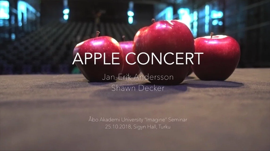 This is a documentation video of our Apple Concert performance presented at the 100 year anniverssary symposium of the Abö Akadamie in Abö Finland. The Apple concert - presented in a large number of iterations - goes all the way back to when Jan-Erik and I were first paired as collaborators by the Chicago Artist Abroad program. At the time, Jan-Erik was doing eating performances, and I was doing electronic music installations, and the sounds of the Apple being eaten - and social eating in general - was an early focus of ours in merging our interests. This work features recorded an processed live sounds that I present, and Jan-Erik is joined by 4 of the heads of the Abö Akadamie in eating apples.