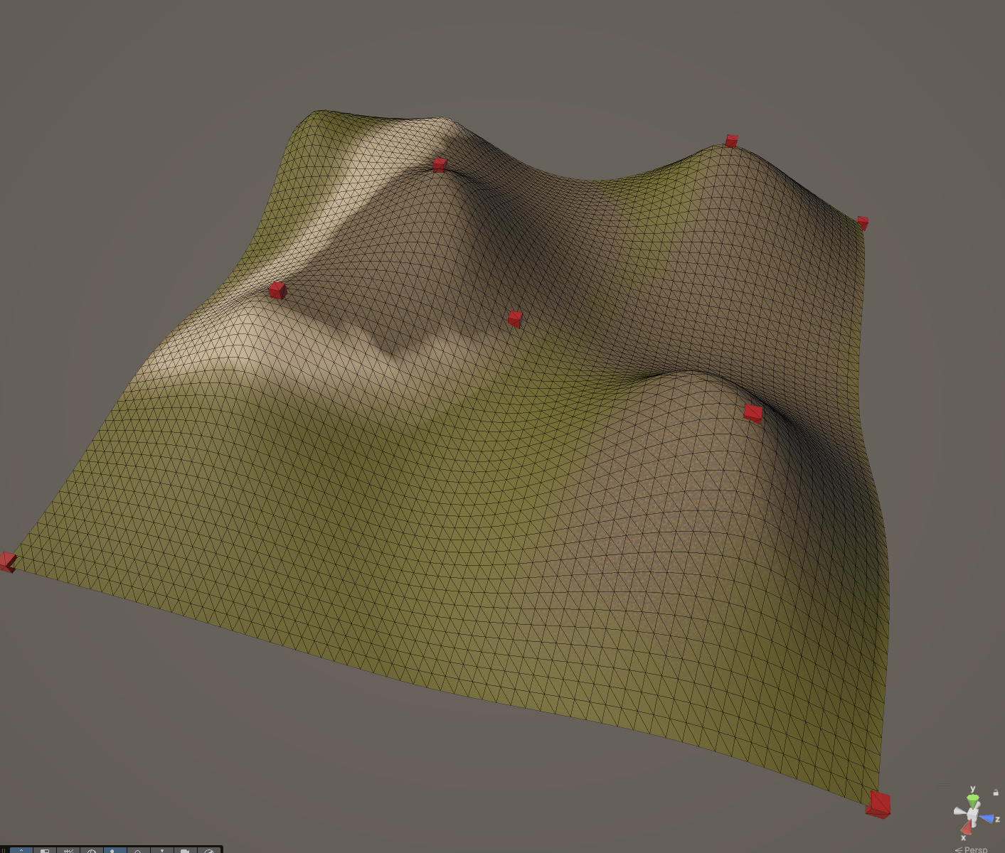 Grassworld is a navigable virtual space that is a rolling topography largely covered with grass and little else (the image shows the space at a large distance, without grass, etc. to give you an idea of the contours). The space is designed for a user to navigate through a soundscape that consists of largely two types of sounds 1) rhythmic and drone sounds from natural ecosystems, and 2) mechanical rhythmic sounds and drones from machines. The natural sounds would be found at the higher elevations, and the mechanical sounds at lower elevations. Different topographic features would have different combinations, and of course some mid-height locations would have a combination of the two types of sounds audible at the same time. All sounds will have a lot of high frequency energy, which generally localizes well, and the height differential of the sounds should be apparent when listening within a multi channel ambisonic configuration, or a dolby configuration with overhead speakers.